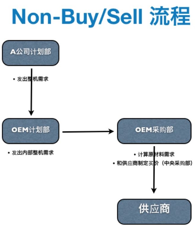 在Non-Buy&Sell的模式下,首先由品牌客戶的計劃部門發出整機的需求計劃給OEM的計劃部,OEM的計劃部在收到需求后將它轉給采購部的各個采購,OEM的采購部人員會根據原材料的用量來計算原材料的需求數量和使用時間。再由采購下訂單給供應商之前,OEM的中央采購部會直接和供應商協商采購價格和采購合同。在拿到采購價格和采購合同后,各個采購人員會下訂單給供應商,并提供訂單的數量和需求時間。供應商在接到OEM的訂單后進行內部生產后再將原材料送到OEM的工廠。